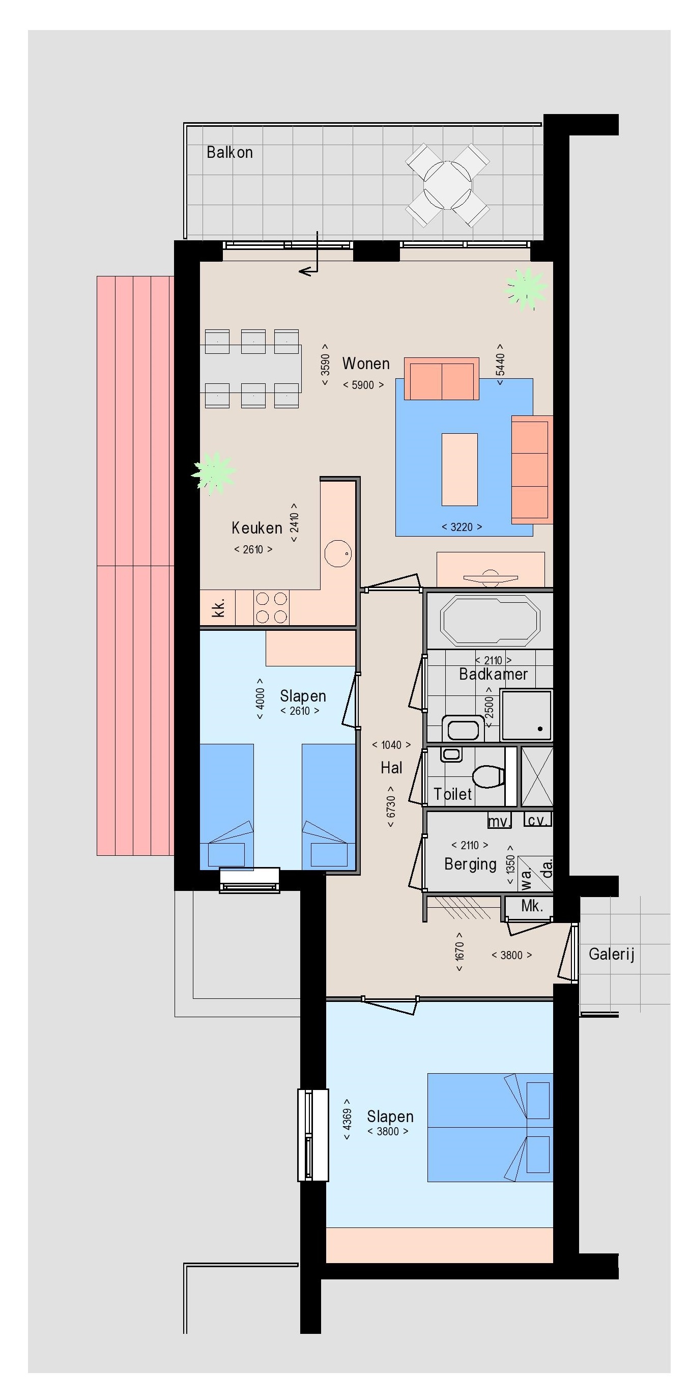 Van dit type appartement is er 1 op de tweede verdieping, ligging op het zuidwesten.