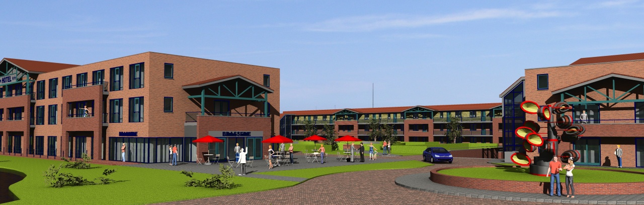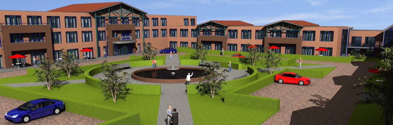 De basisvorm voor het hotel en de 71 appartementen is een bebouwing in carrévorm met een mooi binnenterrein met daaronder de royale parkeerkelder.