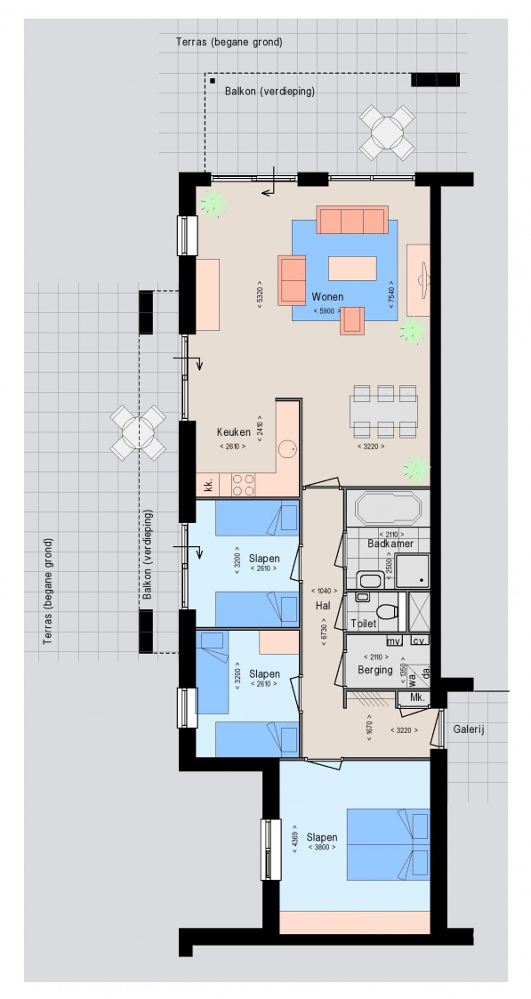 Appartement type D is een hoek-appartement, 1 op de begane grond, BVO 164m2 , met een riante tuin van ca. 337m2, en 1 op de eerste verdieping, BVO 116m2.