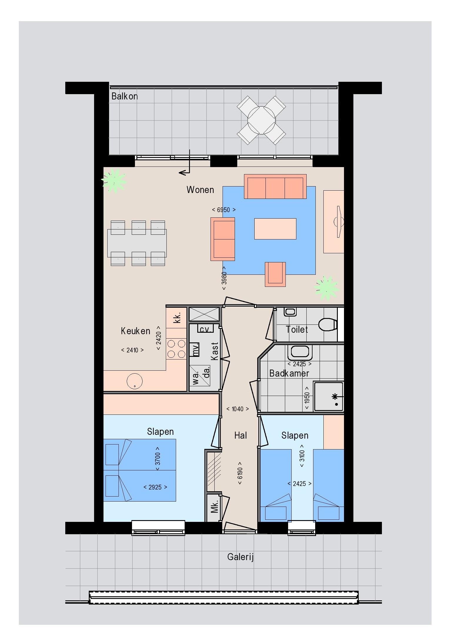 Van dit type appartement zijn er twee appartementen gesitueerd op de tweede verdieping op de zuidwest kant van het complex. Beide appartementen hebben een BVO van 79 m2 en een balkon van 12,3 m2.