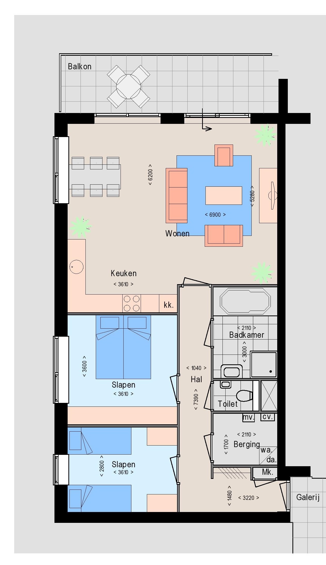 Appartement G is een hoek appartement op de tweede verdieping en ligt op het zuidwesten.