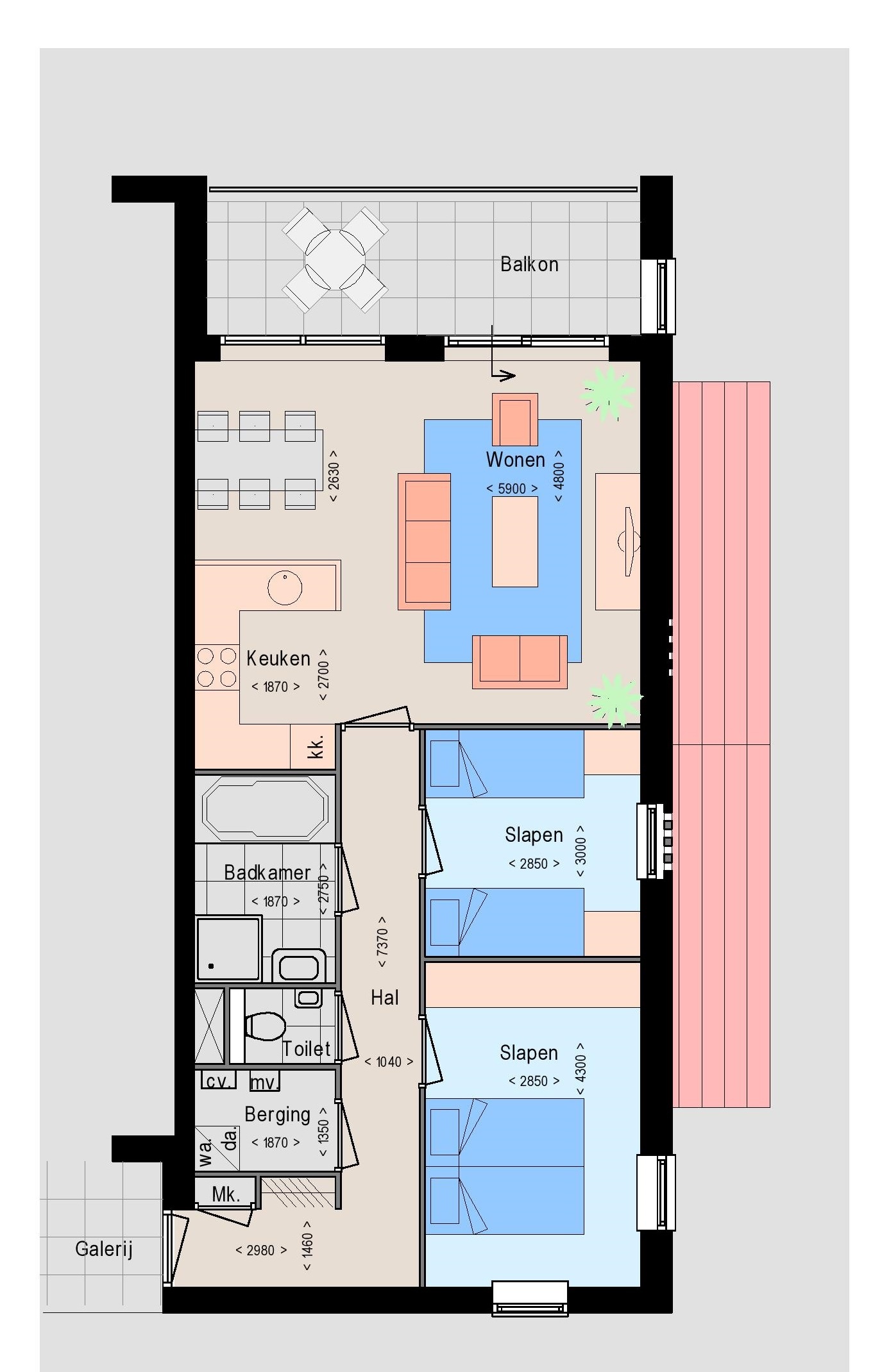Dit appartement ligt op de tweede verdieping en is een hoekappartement voor 4 personen.